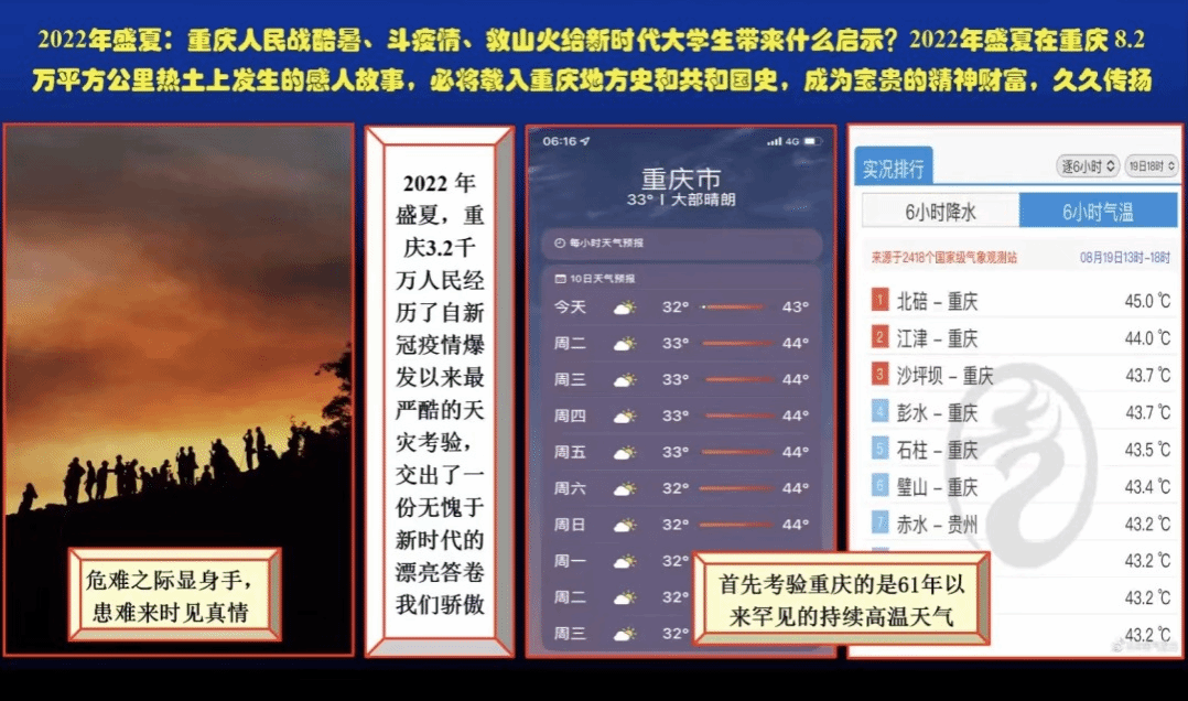 为增强员工们的四个意识,凝聚校园正能量。9月7日晚,重庆大学体育365官网研团委员工会特邀重庆大学体育365官网鄢显俊教授为广老员工上了一堂以"2022年盛夏:重庆人民战酷暑斗疫情救山火给新时代老员工怎样的启示?"为题的云端思政课。公司组织学子观看本次直播。