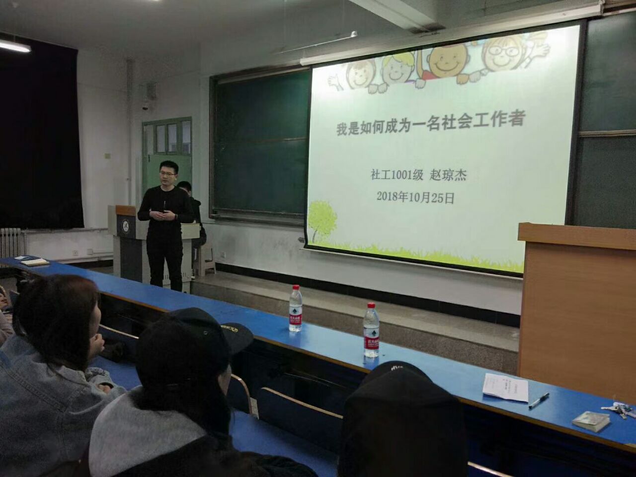 公司社工2011级、2015届毕业生张旺(社会工作师、榆林市青少年社会工作者协会秘书长)以“社工的职业探索与专业发展”为题,首先从个人学习经历出发,向同学们介绍了自其入校以来的学习成长经历,并着重讲解了毕业以来的工作情况。他结合陕西省社会工作开展现状和社会工作相关政策,着重分析了社工专业的职业道路,对在校员工能力养成提供了可行性建议。同时,就目前多元社会发展现状,为同学们多元化的就业方向和渠道提出了建议。