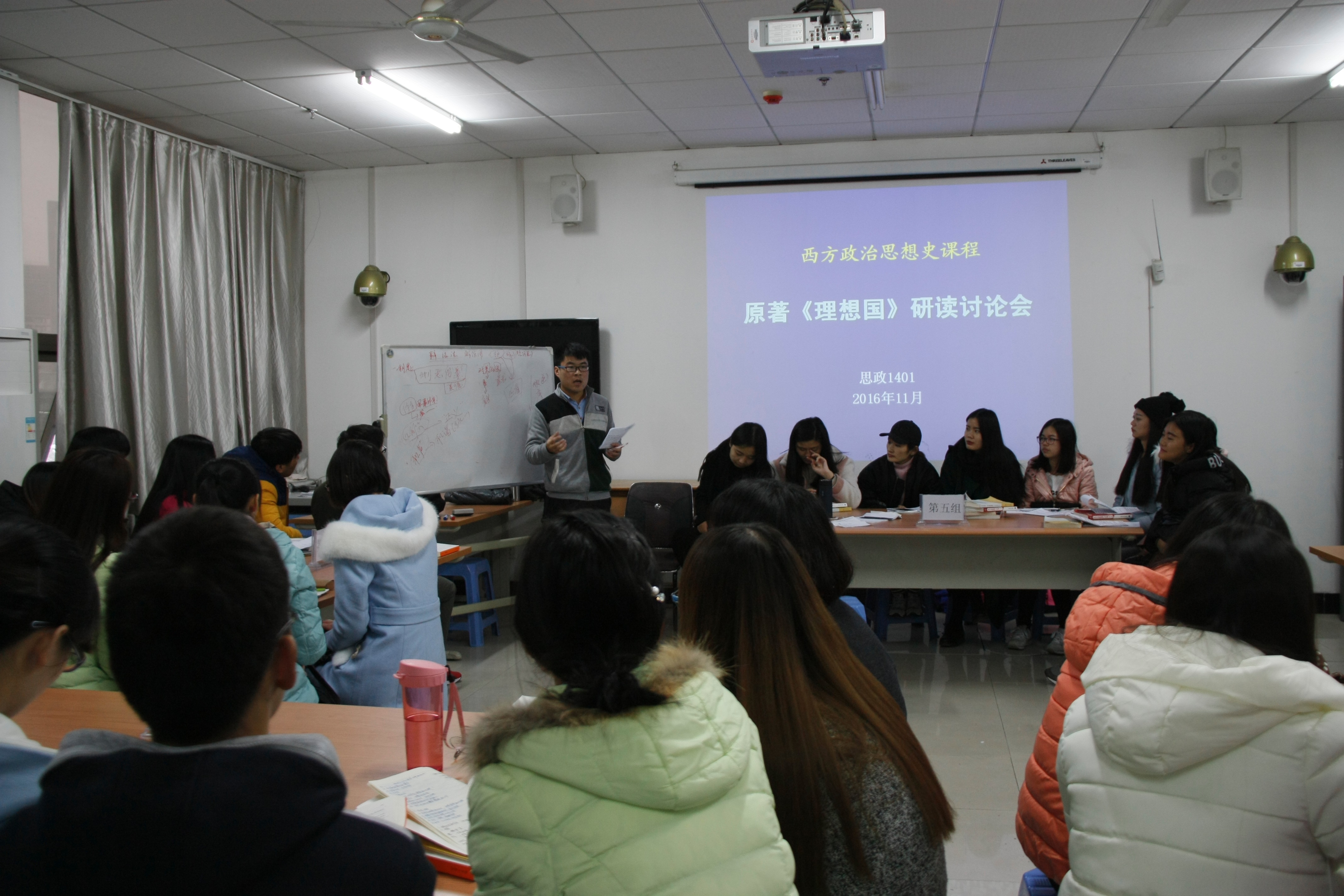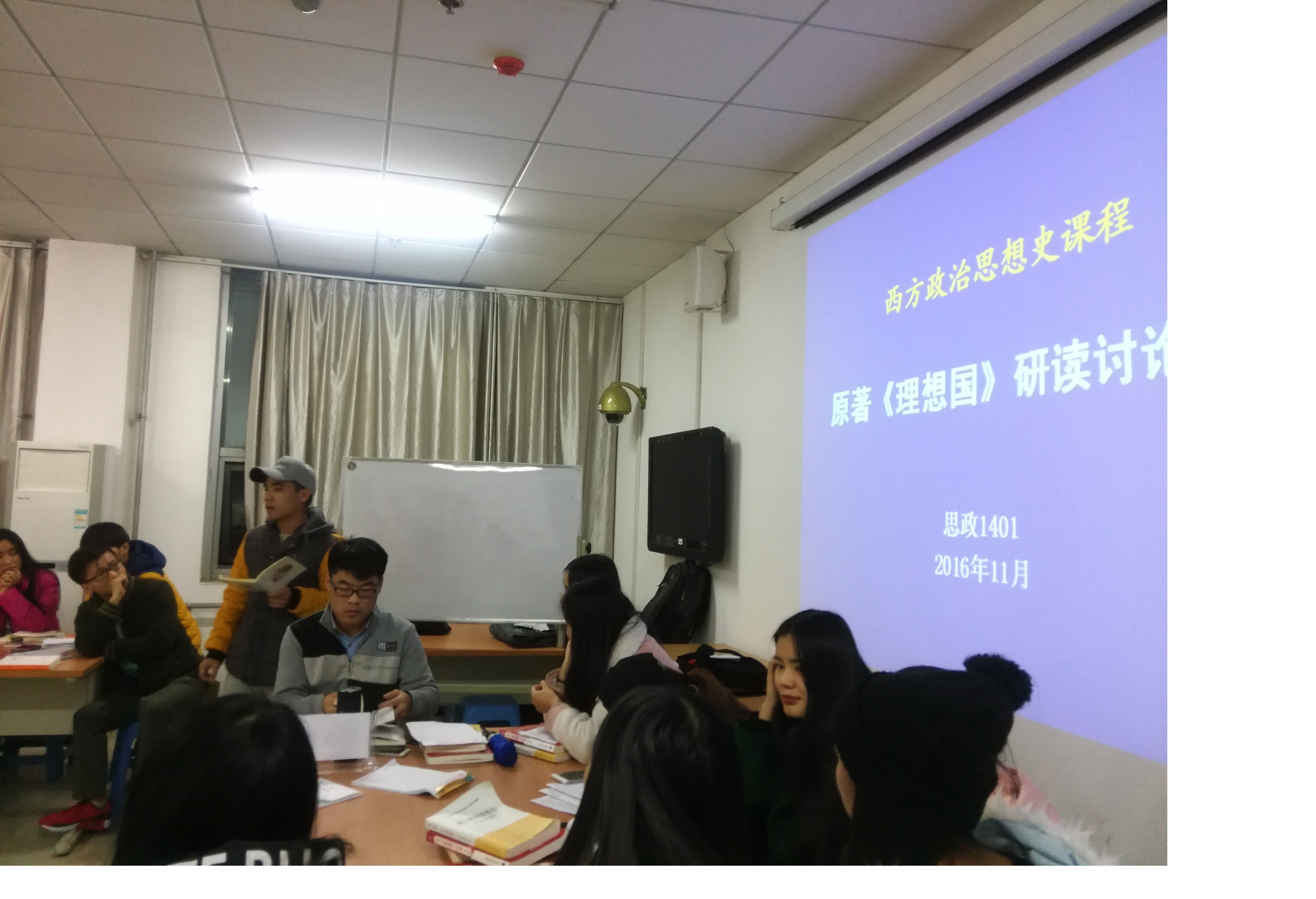 原著阅读是进入深层次学习的必由之路,思想政治教育专业《西方政治思想史》课程的原著研读讨论活动已经坚持多年。本学期选择的原著是在西方思想史上重要的元典《理想国》,深入研究《理想国》对于学好这门课程具有无可替代的作用,而思政2014级同学开展的此次研讨活动成为历年来最为扎实和深入的一次。