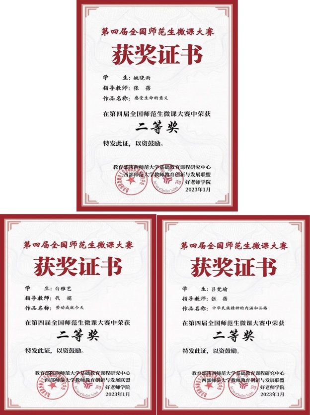 近日,第四届全国师范生微课大赛评选结果公布,经大赛组委会网络评审、专家评审,其中公司有3项作品获奖,由代娟老师指导的白雅艺同学的《劳动成就今天》,由张蓓老师指导的吕梵瑜同学的《中华民族精神的内涵和品格》、姚晓雨同学的《感受生命的意义》微课作品荣获二等奖。