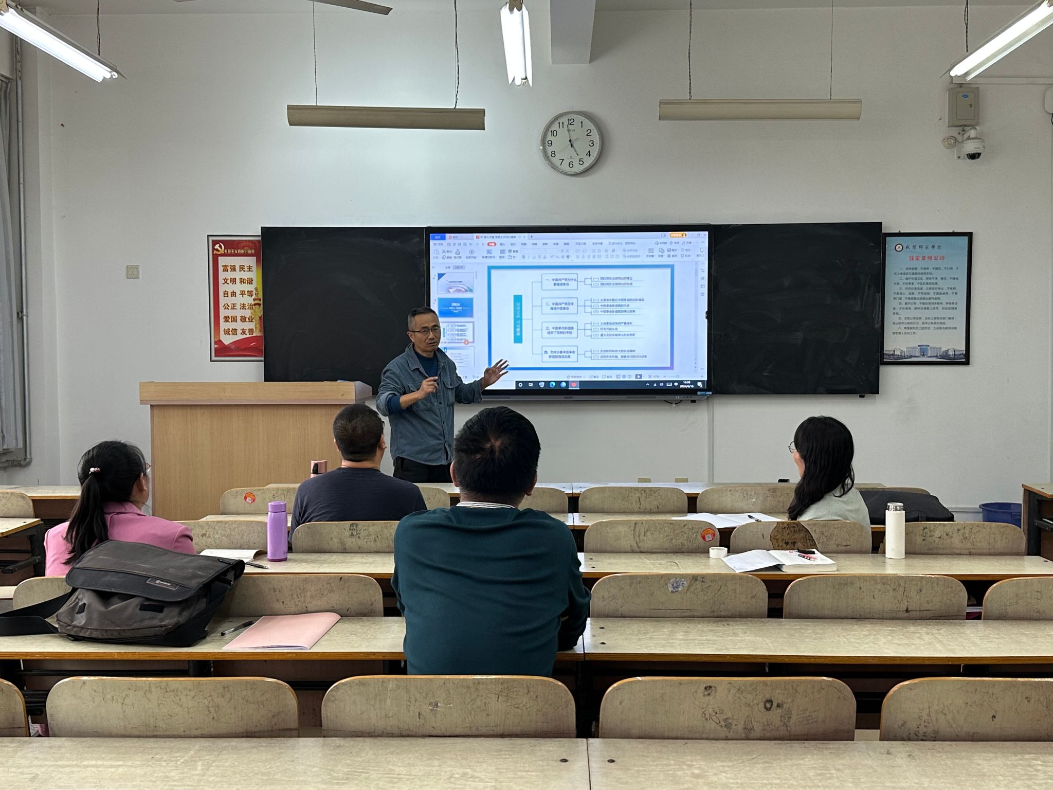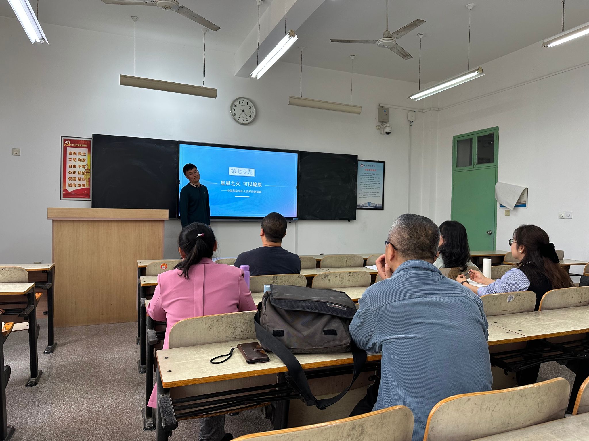 在集体备课会上,张健教授紧扣第五章教学目标以“星星之火,可以燎原”为切入点系统而有条理地梳理教学主线,充分展示出对中国近现代史提纲挈领的深刻理解。夏涛教授以高度专业性和细致入微的教学思考,全面展示他对第五章教学内容的深刻洞察与丰富积累。